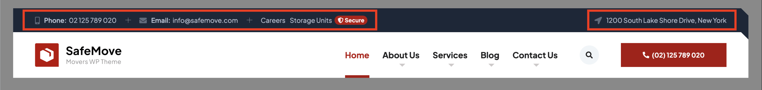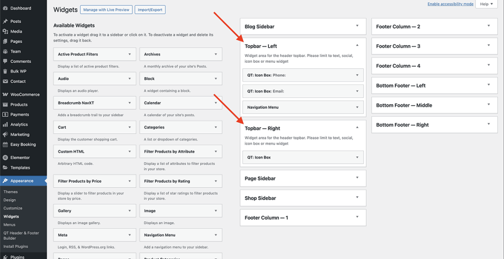 Under Appearance → Widgets, click on the “Topbar Left” and “Topbar Right” panels. Inside these panels, you’ll find widgets that can also be opened to change the default content.