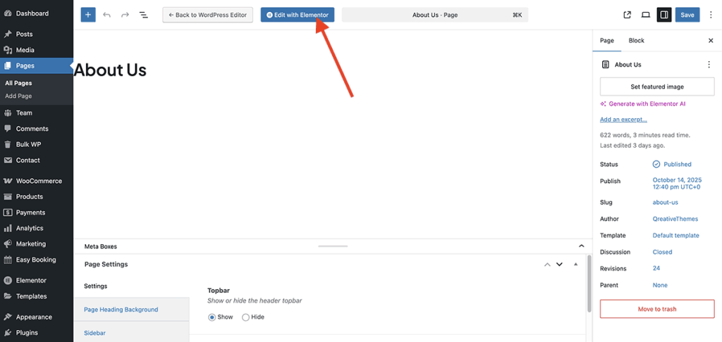 To use the page builder, edit a page and click the “Edit with Elementor” button.