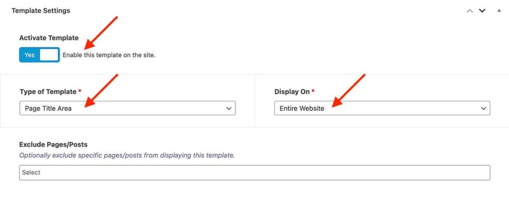 - Ensure the “Type of Template” setting is set to “Page Title Area” and the “Display On” setting is set to “Entire Website”.